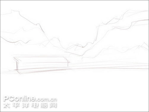 4、刻畫天空,這里我先采用conte筆(孔特筆)畫出云的大概結構,然后用調和筆進行顏色的過渡,最后再用鉛筆畫出云的邊界。這樣可以使繪畫速度提高很多。