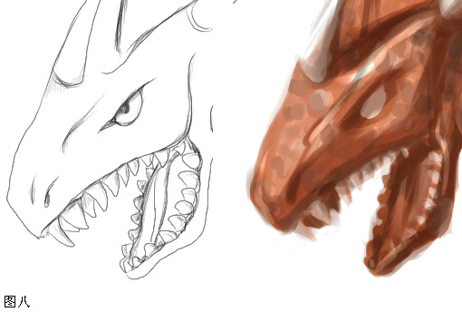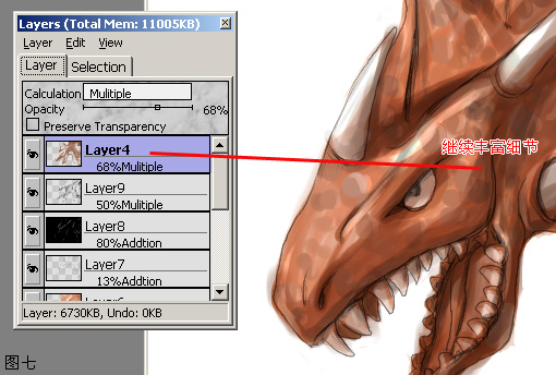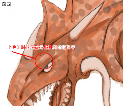 這一步我們將開始快樂的涂抹了,你也可以在上一層里面直接完成這項(xiàng)愉快的工作,在這個(gè)例子里面,筆者新建了一層,還是用的mul模式。涂的時(shí)候最好能夠按照肌肉的走向來,這樣效果會(huì)好一些,你可以想象肌肉慢慢地順著龍的骨骼長出來:)