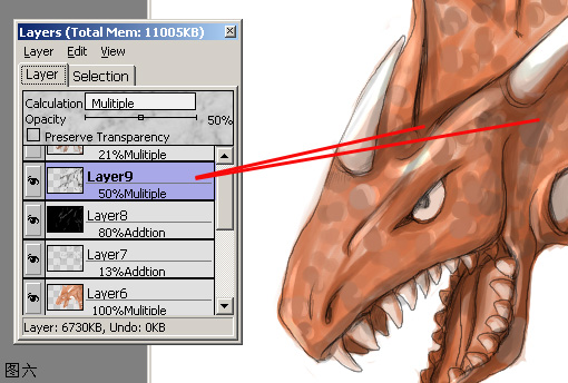 新建一層,用mul模式,我們開始給龍加上陰影,一般這一步在photoshop里面可以用path加上burn工具來完成,由于我們用的是opencanvas,享受的就是涂抹的過程,所以用水彩watercolour來完成,同樣根據(jù)光源來加上這些陰影。最后調(diào)整層的不透明度使得效果自然一些。
