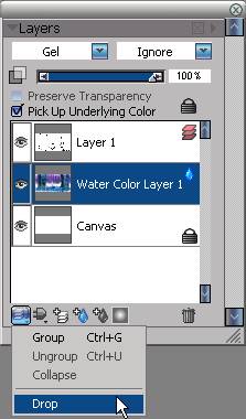 9.在layers面板中選擇drop的命令,合并水彩圖層到canvas層。