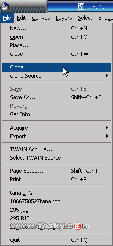 1.打開painter 8,按【ctrl+o】的組合鍵打開一張數(shù)碼照片。執(zhí)行【file】/【clone】(文件/克隆)的菜單命令。(圖2.5.1.1和圖2.5.1.2所示)