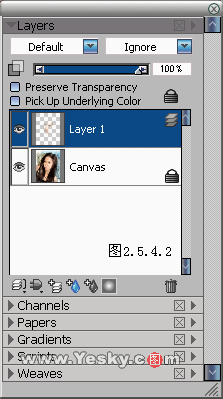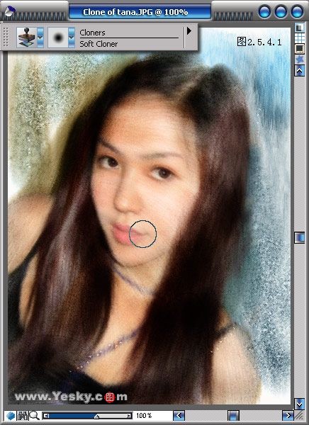 4.用【drop all】的命令合并所有的圖層。新建一層,選用【cloners】/【soft cloner】(克隆/柔性克隆)的筆刷變體,按數(shù)字鍵【1】把筆刷不透明度改為10%。在人物的五官部位輕輕地涂抹,恢復部分細節(jié)。(圖2.5.4.1和圖2.5.4.2所示)