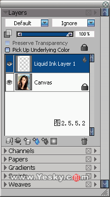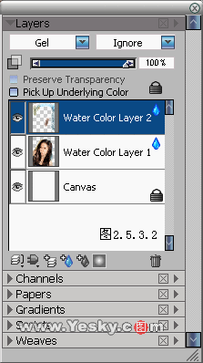 3.新建一個水彩圖層,使用【water color】中的一些筆刷進行背景的自由繪畫,手工添加一些充滿情趣的紋理筆觸。(圖2.5.3.1和圖2.5.3.2所示)