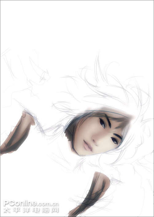 4.加上頭發,用細噴槍畫出發絲,使用橡皮調整