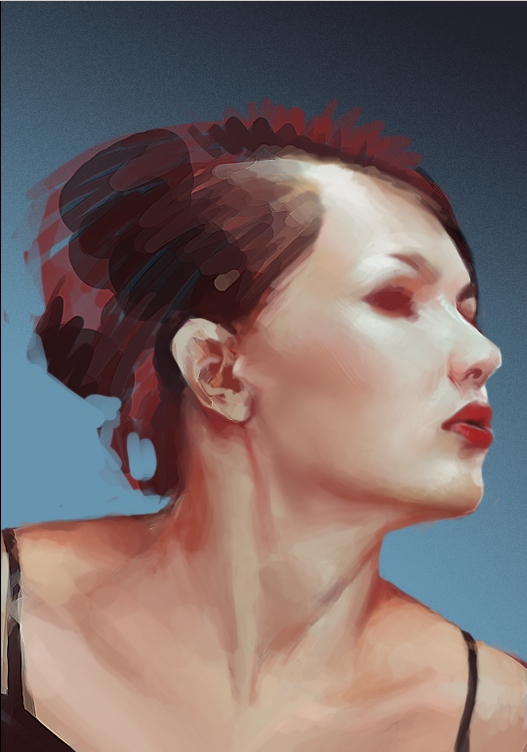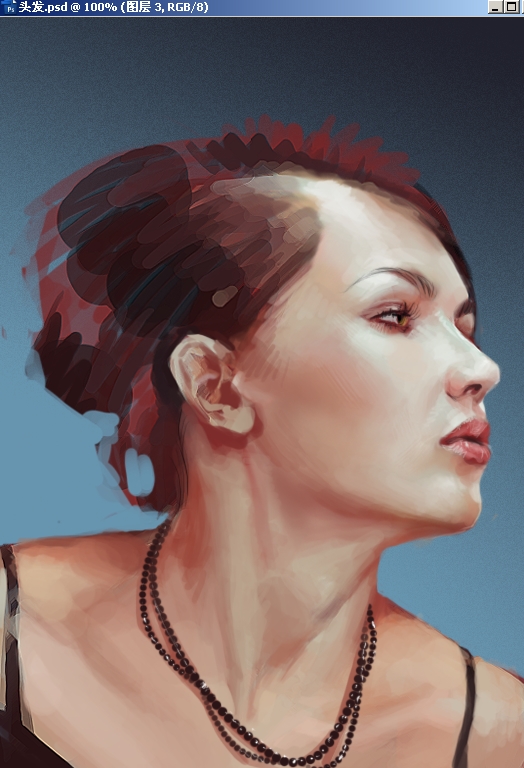 13、現(xiàn)在我們自制的畫筆要登場了。直徑調(diào)整到合適大小,不斷的選用頭發(fā)的系列色結(jié)合上一步所設(shè)計(jì)的頭發(fā)方向來對(duì)頭發(fā)進(jìn)行細(xì)加工。你會(huì)發(fā)現(xiàn)有了這個(gè)筆刷,畫起頭發(fā)方便了好多!不要忘記在頭發(fā)邊緣畫出一些細(xì)小的碎發(fā)。這時(shí)如果感覺局部不舒服,可以用加深提亮工具進(jìn)行局部的修飾。大家如果有興趣可以依照我的這個(gè)步驟練習(xí)一幅。