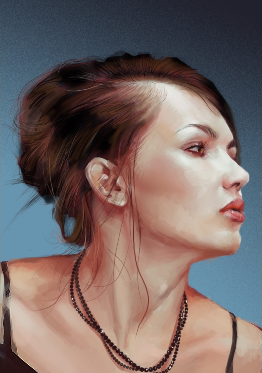 3、調(diào)小筆刷直徑,進(jìn)行細(xì)節(jié)刻畫,有時(shí)候保留部分筆觸會(huì)使畫面更耐看。友基板的高精確度在繪制曲線時(shí)能使你更得心應(yīng)手。注意五官的透視。項(xiàng)鏈部分我是按f5,在畫筆設(shè)置里將畫筆間距調(diào)大,然后刷出的黑色部分,再選擇性的添加些高光。