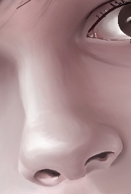 另外,在初稿中,鼻子左邊那條輪廓線是向內凹陷的,在后來的步驟中被改成了向外凸,并且在鼻根部加了一個更加急的凹陷,以體現鼻梁的體積感。從實際上來說,東方人的鼻子比較塌,從面頰突出的程度比不上西方人,所以在畫的時候,東方人的鼻子這里就會是凹陷的,而西方人則會凸出來。