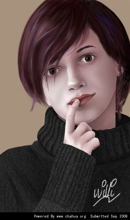 接下來是毛衣,由于質地的原因沒有高光,所以大致畫出色彩和明暗以后使用織物濾鏡做出紋理效果,然后加上背景,簽名收工。以上這些沒有技術含量的事情就不多說了。反正電腦的出現已經使得很多事情的技術含量大大減少了,也許有一天我們對著電腦說幾個命令就可以完成這樣的畫了,所以我決定在繪畫技能在地球上消失之前做以上這些記錄。