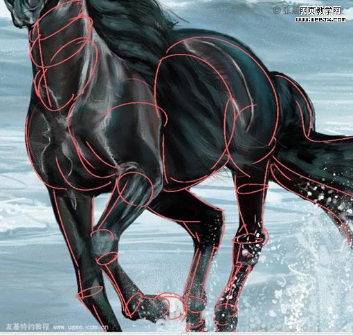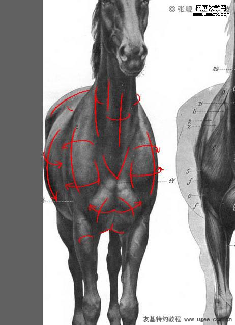 10.這里特別要提的一點是,即便是臨摹練習,也不能“依葫蘆畫瓢”的照著畫。要理解結構,好的參考必不可少,介于這張臨摹練習的馬匹的動態姿勢和角度,前胸肌肉、馬頭和前腿的參考價值比較大。在進一步深入之前可對參考資料進行簡單的結構分析。