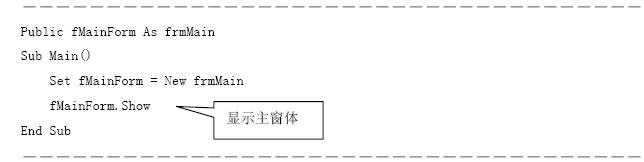 (4)打開模塊module1,查看名為main的過程的代碼如下。說明main過程將啟動名為frmmain的主窗體。
