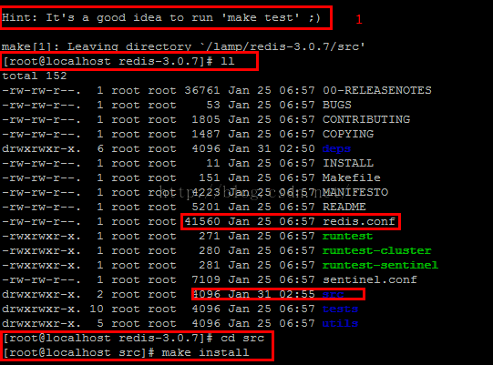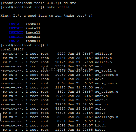 4、編譯成功后,進入src文件夾,執行make install進行Redis安裝