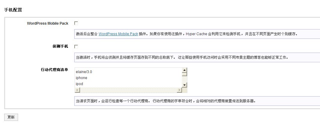 該插件功能特別強(qiáng)大,除了緩存頁面外還能同時(shí)處理普通和gzip壓縮頁面以增加傳輸速度、整合 WordPress Mobile Pack以支持不同的移動(dòng)設(shè)備、支持404頁面及重定向頁面緩存、同時(shí)還支持uri過濾,使頁面對(duì)搜索引擎更友好。但我在使用過程中出現(xiàn)了該插件導(dǎo)致移動(dòng)插件WP Mobile Edition生成的靜態(tài)頁面顯示在電腦瀏覽器的情況,從而出現(xiàn)移動(dòng)主題和電腦主題之間的混亂。研究后發(fā)現(xiàn)必須使用 WordPress Mobile Pack才能正常顯示移動(dòng)主題。