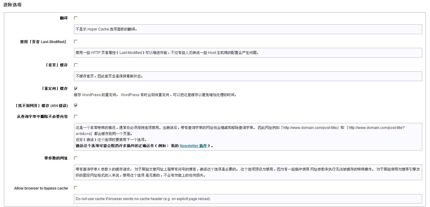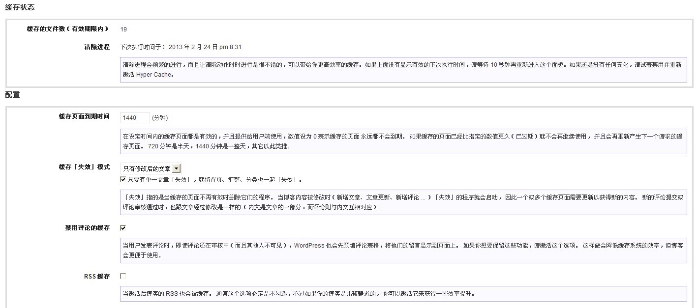 另外一款插件為Hyper Cache,該插件同樣不依賴rewrite。安裝較為簡(jiǎn)單,但是需要注意安裝后需要改wp-config.php文件,在該文件第一行加入代碼 define('WP_CACHE', true);。在實(shí)際操作中我第一次因?yàn)槭怯脤懽职寰庉嫞瑳]有注意中文符號(hào),因此失敗了,修改后一切正常。安裝此軟件有一點(diǎn)需注意,就是固定鏈接必須支持自定義結(jié)構(gòu),否則安裝了也不能正常工作,對(duì)于原因我并不清楚。對(duì)插件的安裝環(huán)節(jié)請(qǐng)參考網(wǎng)上技術(shù)文章,有很多可以參考。安裝完該插件后我的頁面加載速度從原來的3-4秒縮減到1秒左右。感覺真是飛一般快。