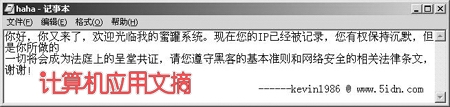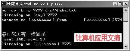 我在C:下新建了一個文本文件haha.txt,寫上一些話后保存(如下圖)。在cmd窗口中輸入“c:nc.exe -vv -L -p 7777 < c:haha.txt”,看到屏幕顯示了“listening on [any] 7777 ...”后就招呼表弟過來一起玩游戲,而把這個cmd窗口放在那里,只時不時地注意一下動靜。這是因為,黑客一旦發現失去了這臺電腦的控制權,就會利用他所布置的后門再次入侵。我就是利用了他的這個心理,準備給他一個深刻的“回憶”。