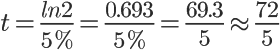 上式最后一個等號,表明用72除以增長率,可以得到翻倍的大致時間,這就是72法則的來源。
