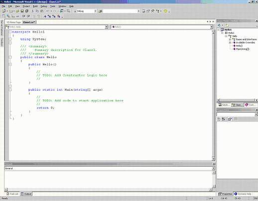 現(xiàn)在我們要增加一些代碼來執(zhí)行一些有用的操作。第一件事是將右上角的窗口切換到Class View(類視圖),然后展開"Hello1" 名稱空間,點(diǎn)擊 "Class1" 類。在屬性窗口中將名稱修改為Hello。現(xiàn)在的代碼窗口變?yōu)椋?/TD> |