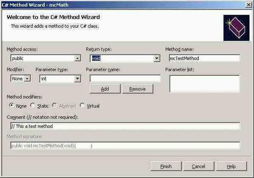 用鼠標右鍵單擊“Class1”,選擇“Add(增加)-> Add Method(增加方法)”,這時將彈出C# 方法生成向導: |