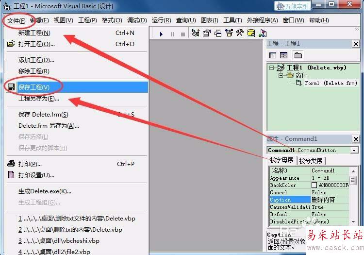 5、單擊文件菜單中的保存工程選項,將工程保存在文件夾中,取名為Delete。