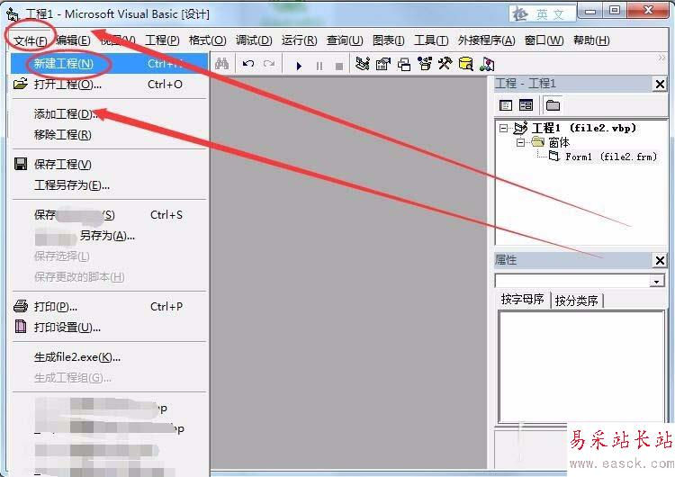 2、打開的VB窗口中,選擇文件---->新建工程選項。
