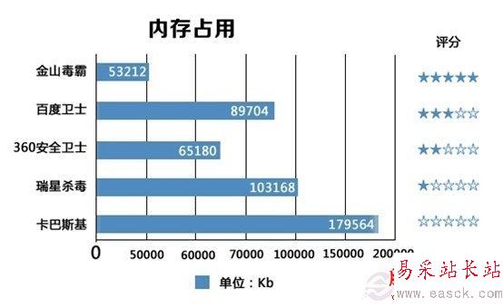 安裝XP系統的老機器大部分硬件配置都不會高,內存占用就成了一個影響非常大的因素,此項參數對比金山毒霸強勢奪冠,而卡巴斯基再次墊底。