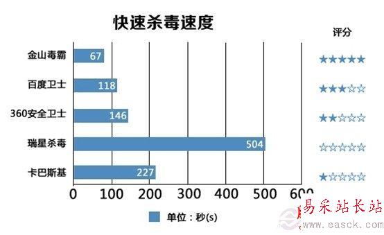 全盤掃描用戶并不會天天用,而快速殺毒也就成了最常用的掃描檢測系統重要位置安全性的方法,這個參數在實際應用中非常重要。本次金山毒霸再次以強勢奪冠,卡巴中規中矩,而瑞星成績墊底。