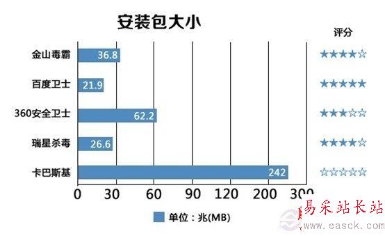 百度衛士因21.9M安裝包大小此輪獲勝,金山毒霸與瑞星殺毒也比較適中,卡巴斯基卻是驚人的242M。