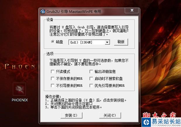 這里要說明一下,在“設備”里有兩個選項,一個是電腦的硬盤,一個是要制作的U盤。這里一定要選對U盤而別選錯硬盤,從大小就能分出來哪個是U盤。筆者的U盤是2G的,所以應該選擇(hd1)[1898M]。下面的“選項”部分可以不用管,默認不勾選任何參數(shù)就行。確認好以上步驟后,點“安裝”然后進行下一步。