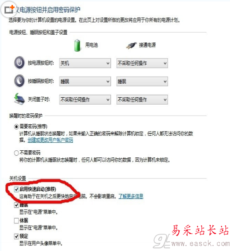 在下邊關機選項去掉‘啟用快速啟動(推薦)’前面的勾。然后保存修改。