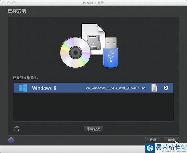 2、Parallels會自動掃描本地存儲的系統安裝文件,在已找到的操作系統中選擇安裝即可。若未找到可通過手動查找”按鈕自定義查找,點擊“繼續”進入下一步:如圖。Parallels Desktop將自動顯示已找到的操作系統,選擇一個進入安裝,這里選擇“安裝Windows 8 64位”。點擊“繼續”進入下一步。