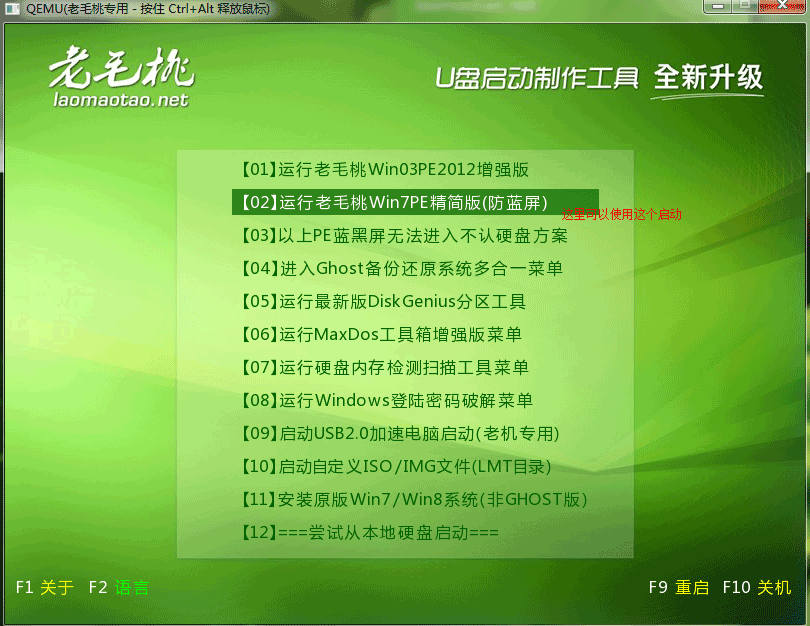 2.電腦重啟,部分電腦的BIOS的快捷鍵可能不一樣,記得好像選擇啟動盤直接是F12的!直接選擇從U盤啟動就可以了,然后就會出現如下的界面了