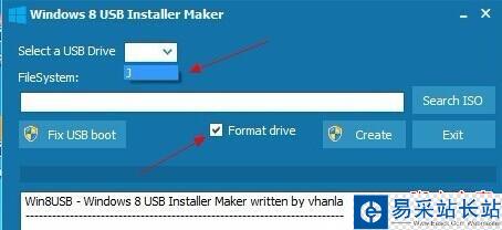 3、插入U盤(請用一個沒有數(shù)據(jù)的U盤),在Windows 8 USB Installer Maker界面下點擊Select a USB Drive(選擇 USB 驅(qū)動器)下拉框,選擇U盤盤符,并勾選Format drive(格式化驅(qū)動器)項目。