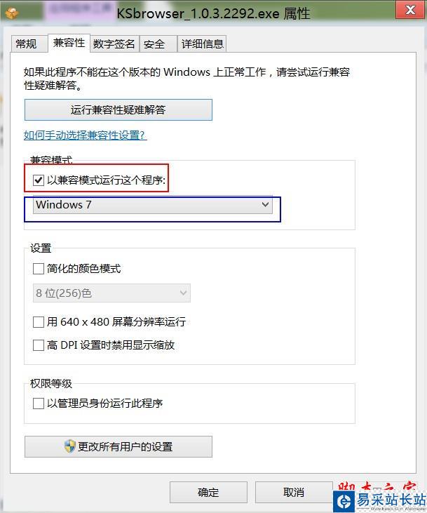 3.切換到"兼容性"標簽,然后把"兼容模式"下打勾,如圖中的紅色框,兼容性下拉框(圖中藍框)里選擇windowsXP或者windows7都可以,.然后點"確定".