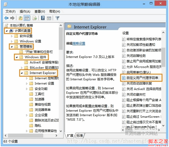 2. 定位到計算機配置 → 管理模板 → Windows 組件 → Internet Explorer → 自定義用戶代理字符串;