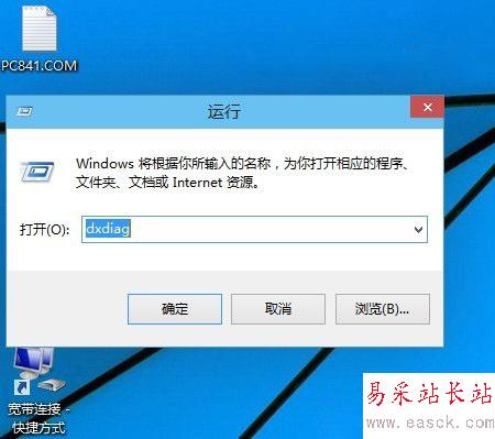 一、在Win10桌面界面下,首先使用鍵盤上的【Win】+ 【R】組合快捷鍵打開運行對話框,然后在“打開”后面輸入【dxdiag】命令,之后按回車鍵或者點擊底部的【確定】打開,如下圖所示。