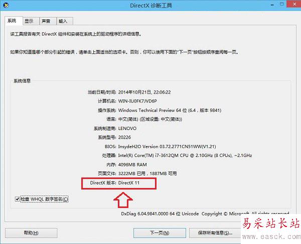 由于錯新站長站小編目前使用的是Win10技術預覽版,從圖中可以看出,Directx版本和Win8.1一樣,依舊是DirectX 11版本,并不是DirectX 12,不過即將于2015年推出的Win10正式版將內置最新的Directx12版本,正式版期間,大家可以再使用這種方法查看Win10的Directx版本。