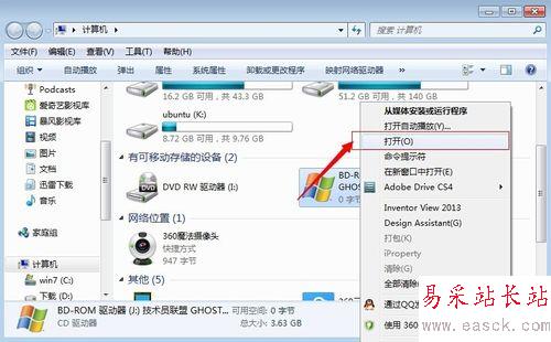 6、然后打開我的電腦,可以看到光盤鏡像文件已經被載入,然后右擊--打開命令。