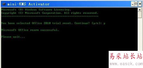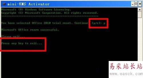 7、然后點擊最下面的Rearm Office 2010,輸入y,按回車,等待一會,出現“Prease any key to exit.。。”,就可以把當前的對話窗口關閉了。