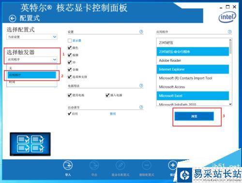 3、打開選擇觸發器,選應用程序,在瀏覽里找到迅雷影音的快捷方式或者主程序,雙擊即可將迅雷影音切換到集顯下運行
