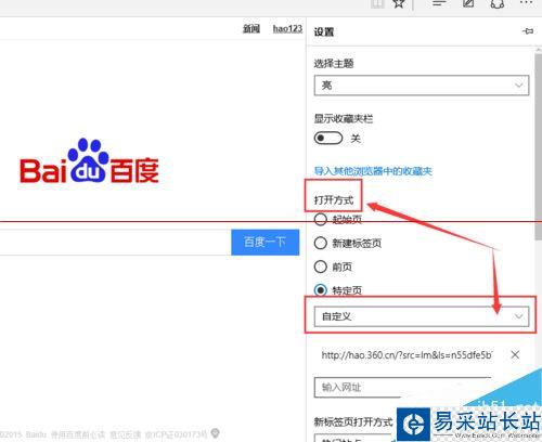 3、進入“設置”選項,下拉找到“打開方式”,選擇“自定義”(或者選擇“MSN”或“必應”就不可以自己設定主頁了)