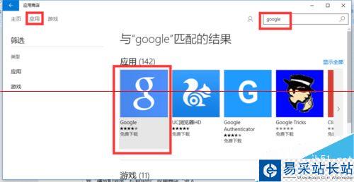 2、待打開“Win10應(yīng)用商店”界面后,切換到“應(yīng)用”選項卡,在搜索框中輸入“Google”進行搜索,從搜索結(jié)果中選擇如圖所示的應(yīng)用點擊進入。