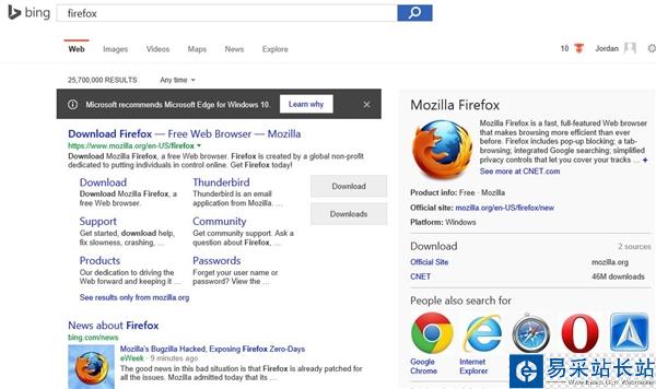 當(dāng)用戶使用默認搜索引擎Bing來搜索Chrome或者Firefox(火狐)時會出現(xiàn)一個提示按鈕“微軟建議在Windows 10中使用Edge瀏覽器”,點開按鈕則會跳轉(zhuǎn)至一個介紹Edge瀏覽器新特性的頁面。對此,業(yè)內(nèi)人士認為微軟對于自家新產(chǎn)品的宣傳已經(jīng)無所不用其極,不過這依舊無法彌補Edge瀏覽器在一些功能上的短板,比如插件擴展。