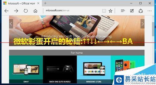 4、待進(jìn)入“微軟英文官方網(wǎng)站”主頁后,需要再輸入“秘籍”才能查看“微軟彩蛋”頁面,開啟“微軟彩蛋”畫面的“秘籍”是“↑↑↓↓←→←→BA”,其中“箭頭”表示鍵盤上的方向鍵。