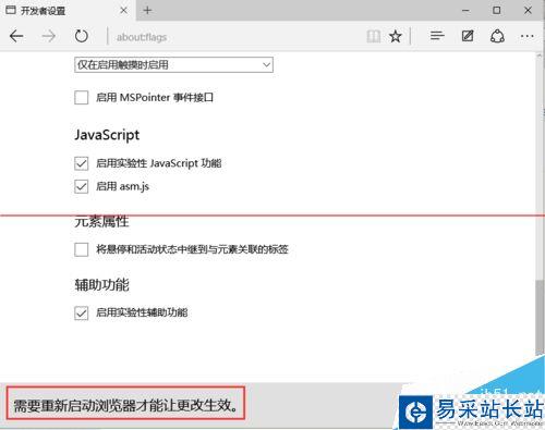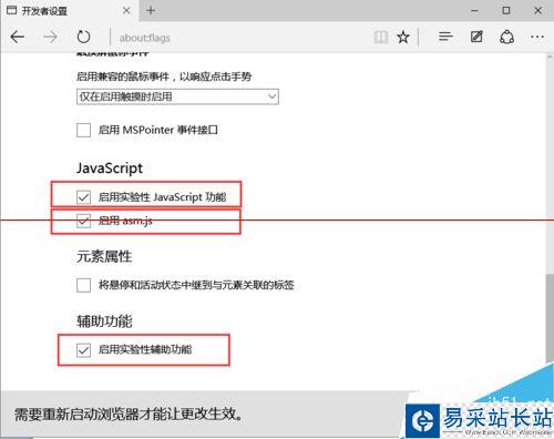 2、在開發者設置找到并勾選:啟用實驗性JavaScript功能,啟用asm.js和啟用實驗性輔助功能三個選項: