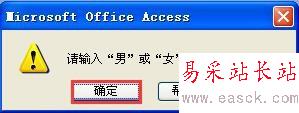 7、保存對該表所做的修改。通過上述設置后,在添加新記錄時,如果在“性別” 字段中輸入的不是“男”或“女”,系統將會自動提示我們在“有效性文本中”設置的提示信息。
