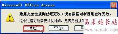 6、如果表中已經輸入了記錄,則添加字段的有效性規則之后會彈出下圖所示的對話框,提示添加的有效性規則可能對已有的數據無效,是否用新規則來對現有的記錄進行測試,單擊“是”按鈕進行測試,單擊“否”按鈕或“取消”按鈕,則不進行測試。