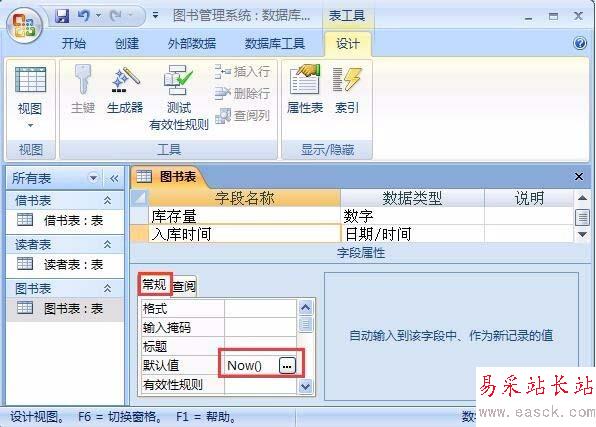 2、選擇要設置默認值的字段,然后在下面“常規”選項卡的“默認值”文本框中填寫默認值“Now()”。