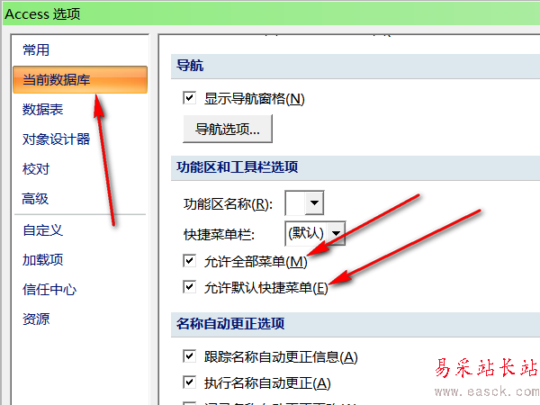 2、在access選項(xiàng)、當(dāng)前數(shù)據(jù)庫(kù)設(shè)置中,可以看到如圖所示的選項(xiàng),關(guān)掉這兩個(gè)選項(xiàng)