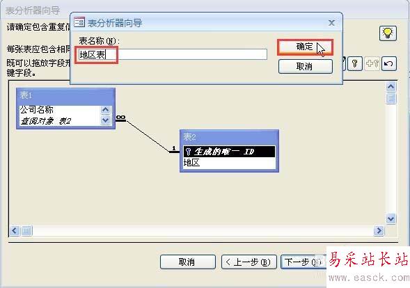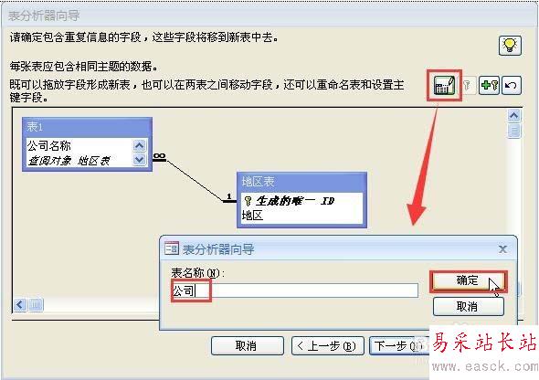 7、單擊“表1”窗口,然后單擊命名 按鈕,在彈出的命名對話框中將“表1”的名稱改為“公司”,單擊“確定”按鈕完成命名,然后單擊“下一步”按鈕。