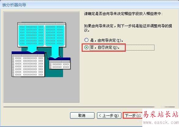 4、在打開的“是否使用向導”選擇界面中,選中“否,自行決定”單選鈕,單擊“下一步”按鈕。