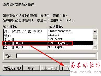 6、選擇掩碼的格式,筆者想給日期設置掩碼所以選擇了一個長日期。點擊下一步